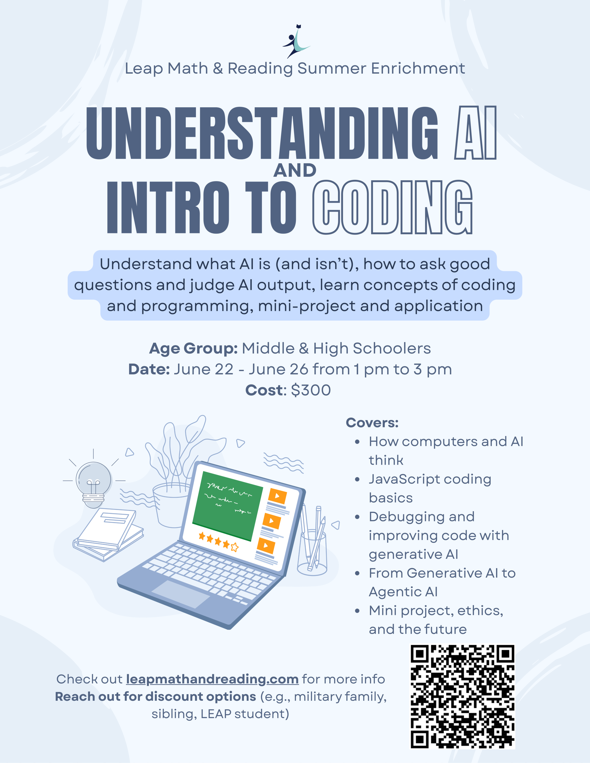 This program will teach your children to understand what AI is (and isn’t), how to ask good questions and judge AI output, learn concepts of coding and programming, mini-project and application. Throughout the week, students will cover how computers and AI think, JavaScript coding basics, debugging and improving code with generative AI, from Generative AI to Agentic AI, and mini project, ethics, and the future.