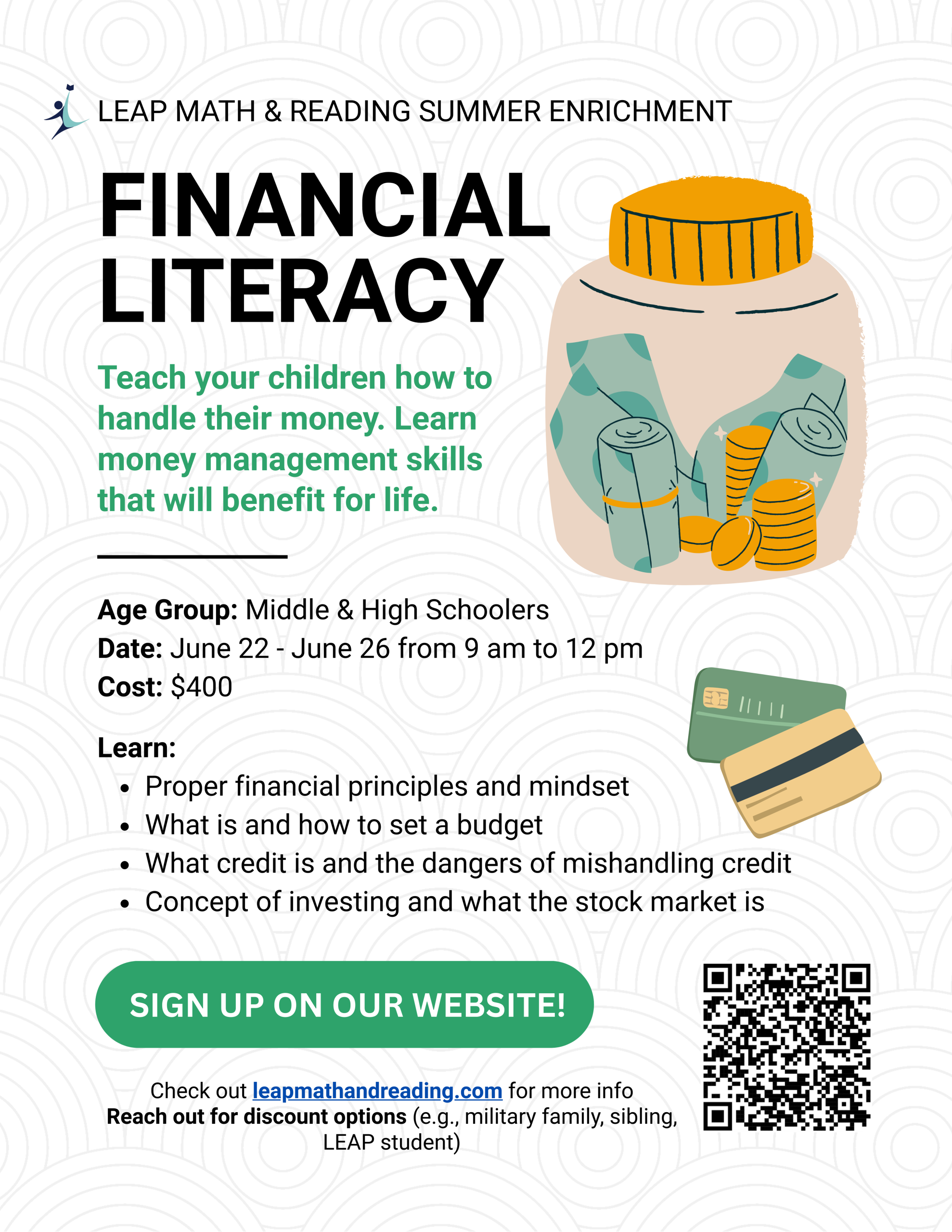 This program will teach your children how to handle their money. Learn money management skills that will benefit for life. Throughout the week, students will learn proper financial principles and mindset, what a budget is and how to set one, what credit is and the dangers of mishandling credit, and the concept of investing and what the stock market is.